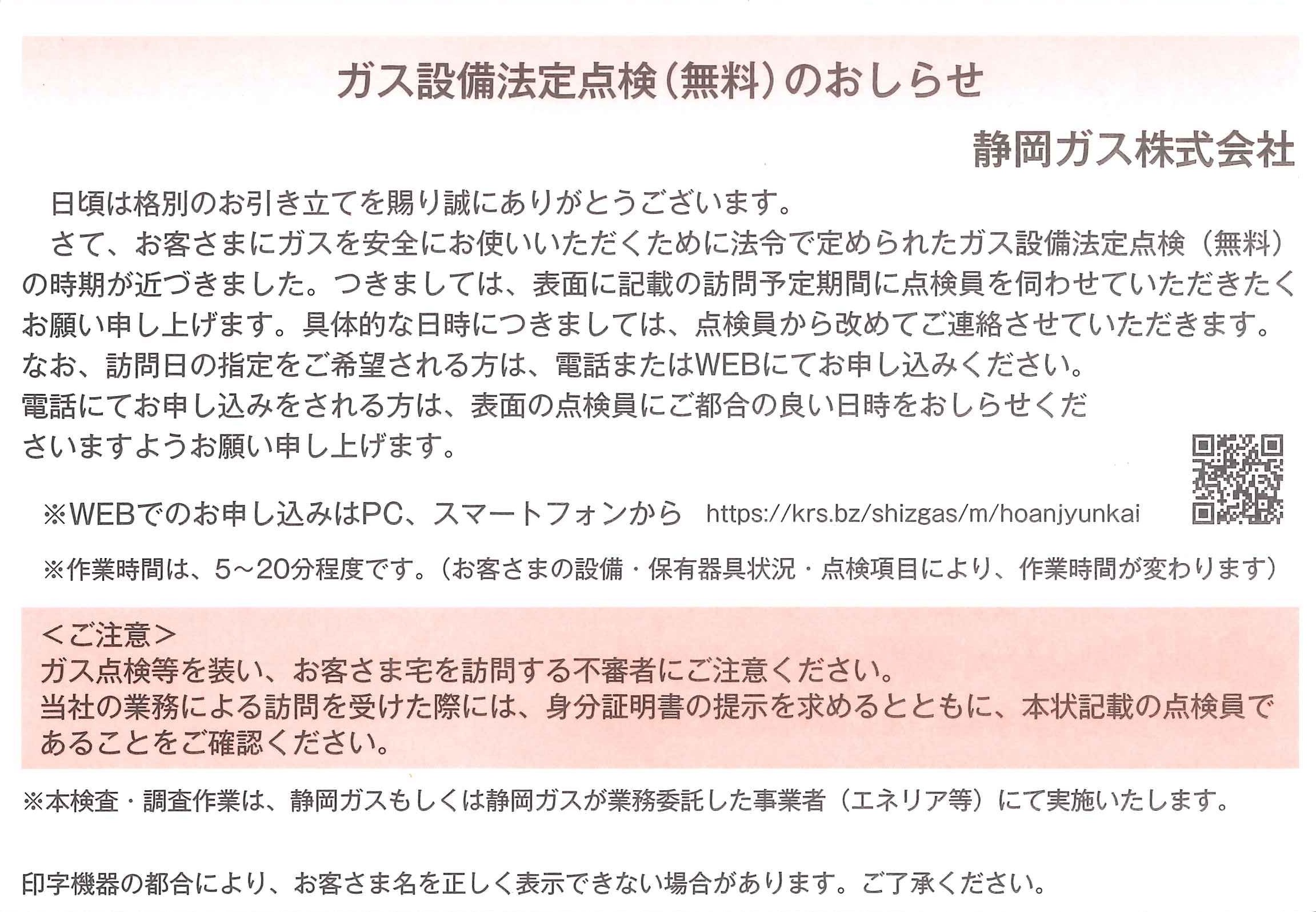 対象のお客さまに対し、事前に点検へのご協力のお願いと訪問期間等を下記のハガキでご案内いたします。