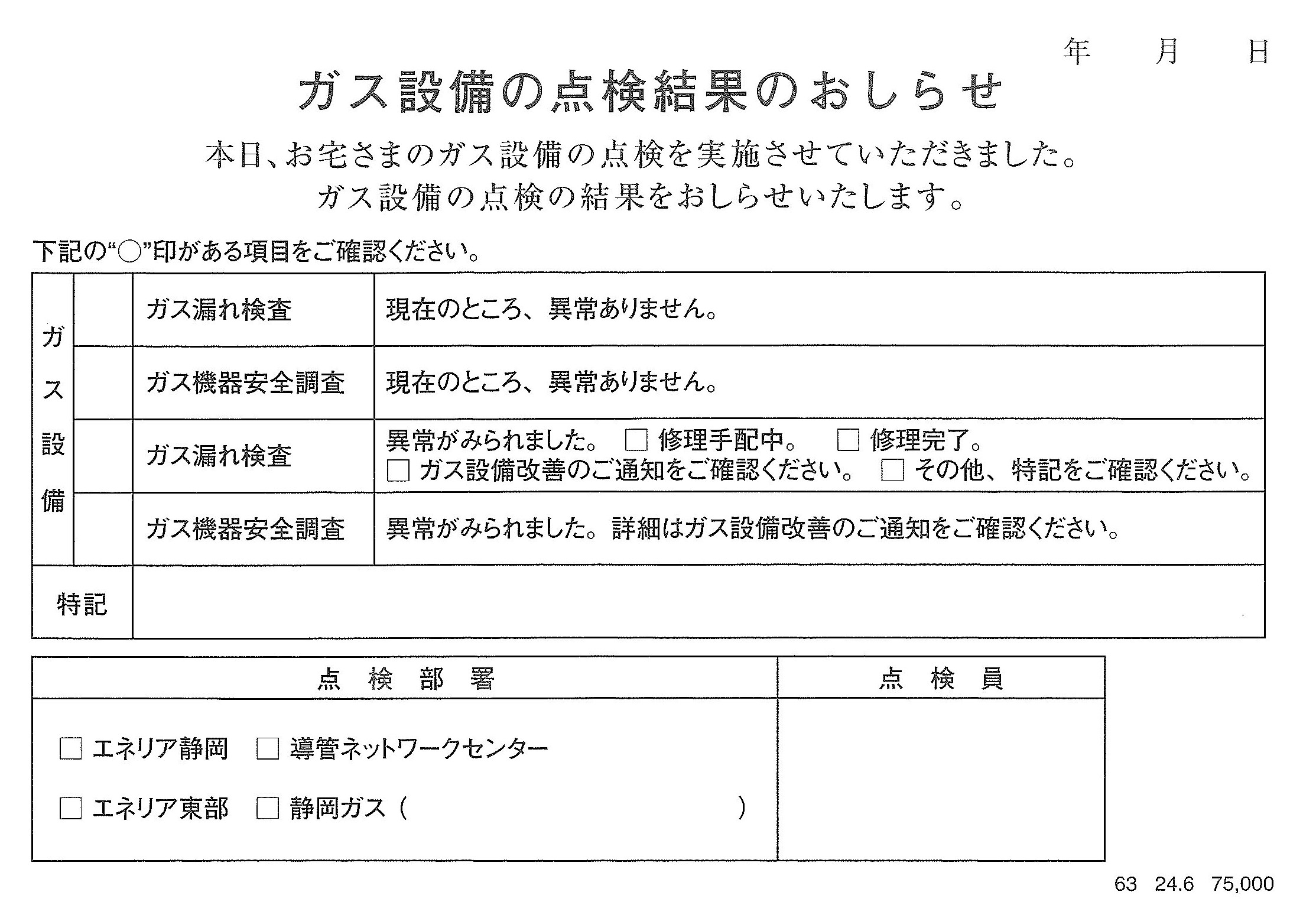 点検が終了しますと「ガス設備の点検結果のおしらせ」を安全周知パンフレットとともにお渡しいたします。