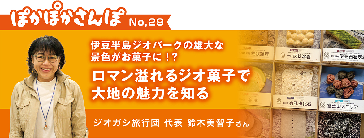 そうなの!大地の魅力をたくさん伝えたいという思いから伊豆半島ジオパーク認定ジオガイドの資格をとって、ジオ菓子を持参し実際の場所を巡るツアーを開催しているの。