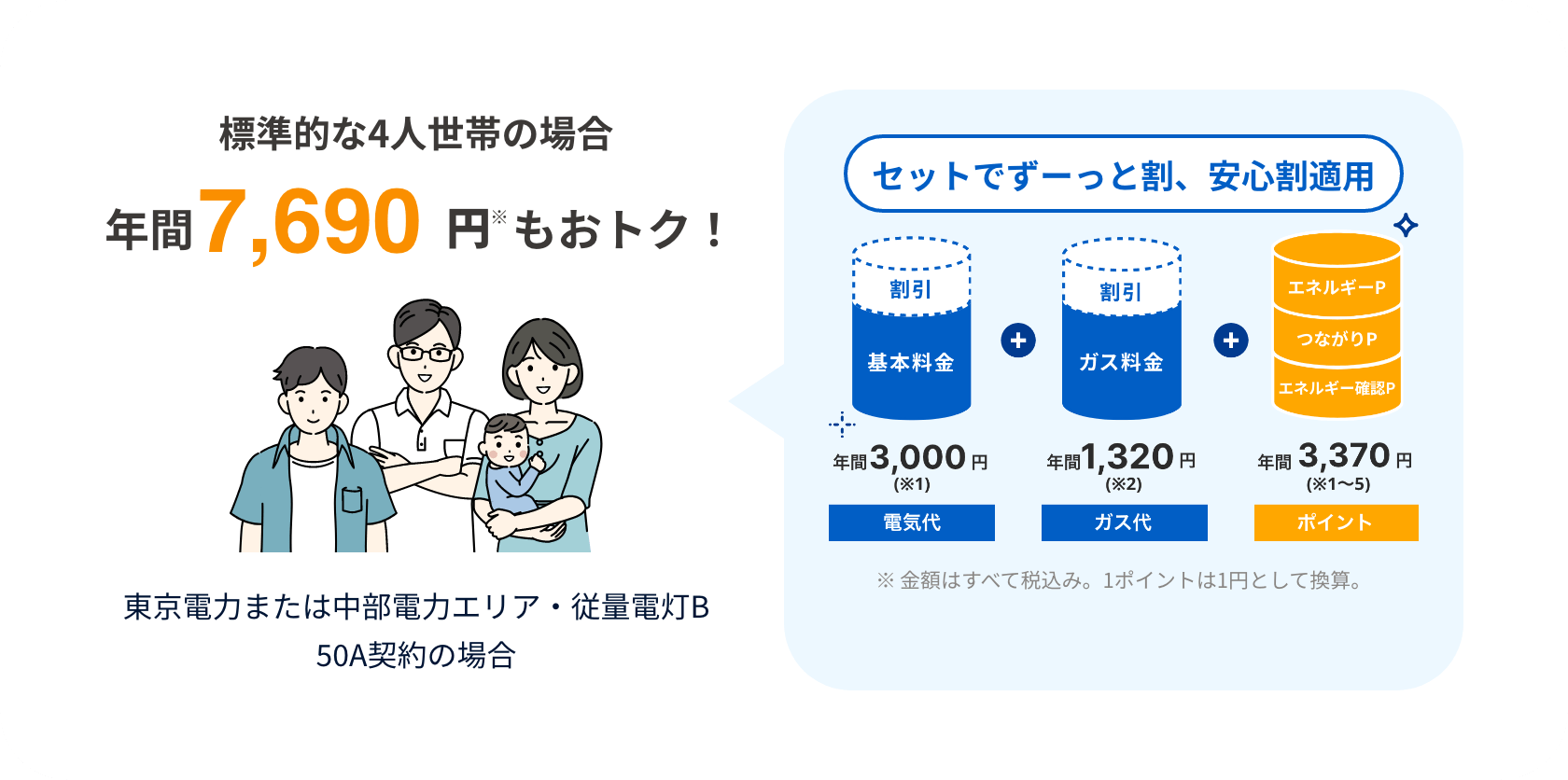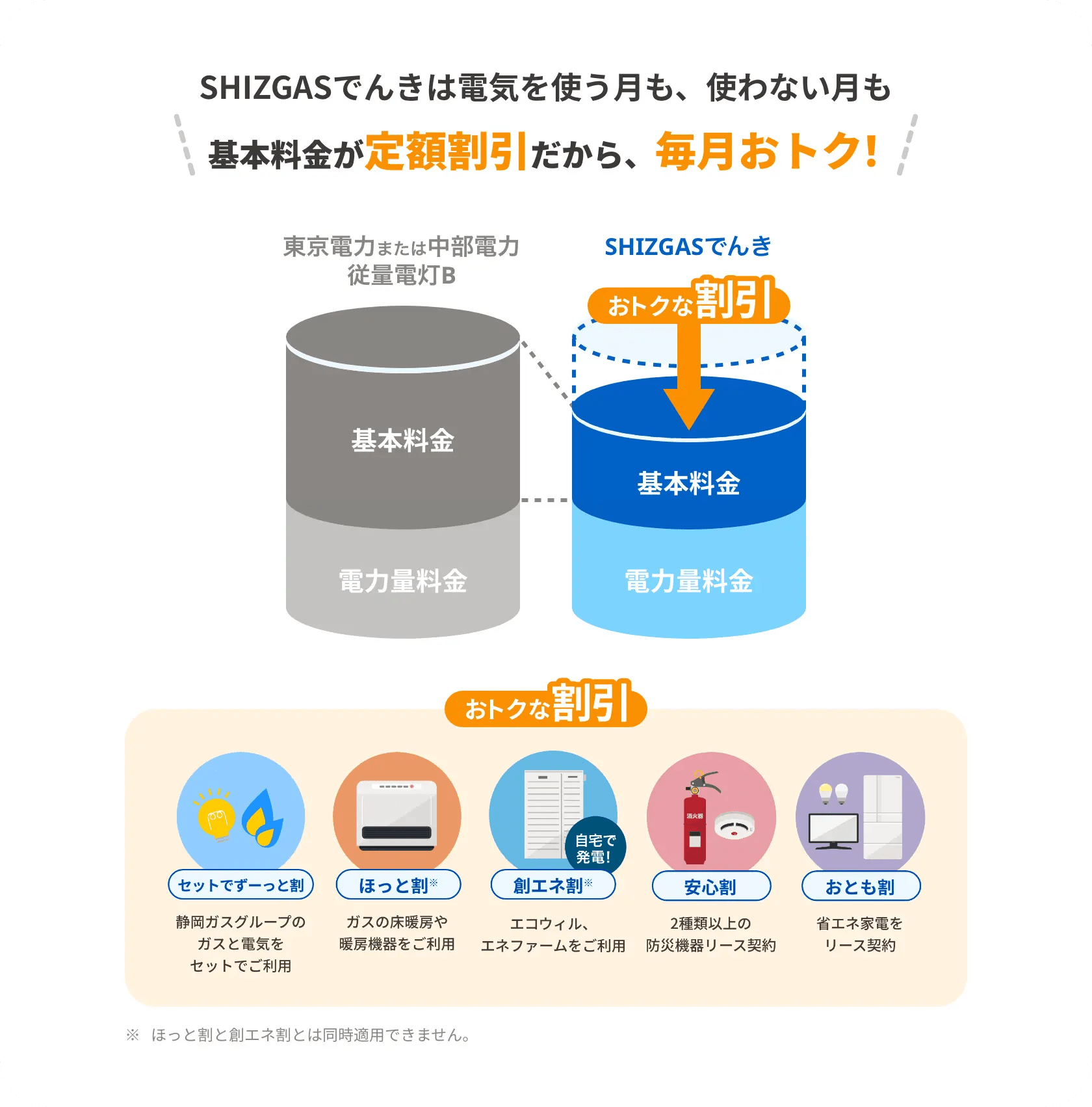 静岡ガスの都市ガス「一般ガス供給約款」「エコ得プラン」「ぽかぽかプラン2」または静岡ガスエネルギーで対象となるガス料金プランを、電気契約と同日使用場所でご利用の