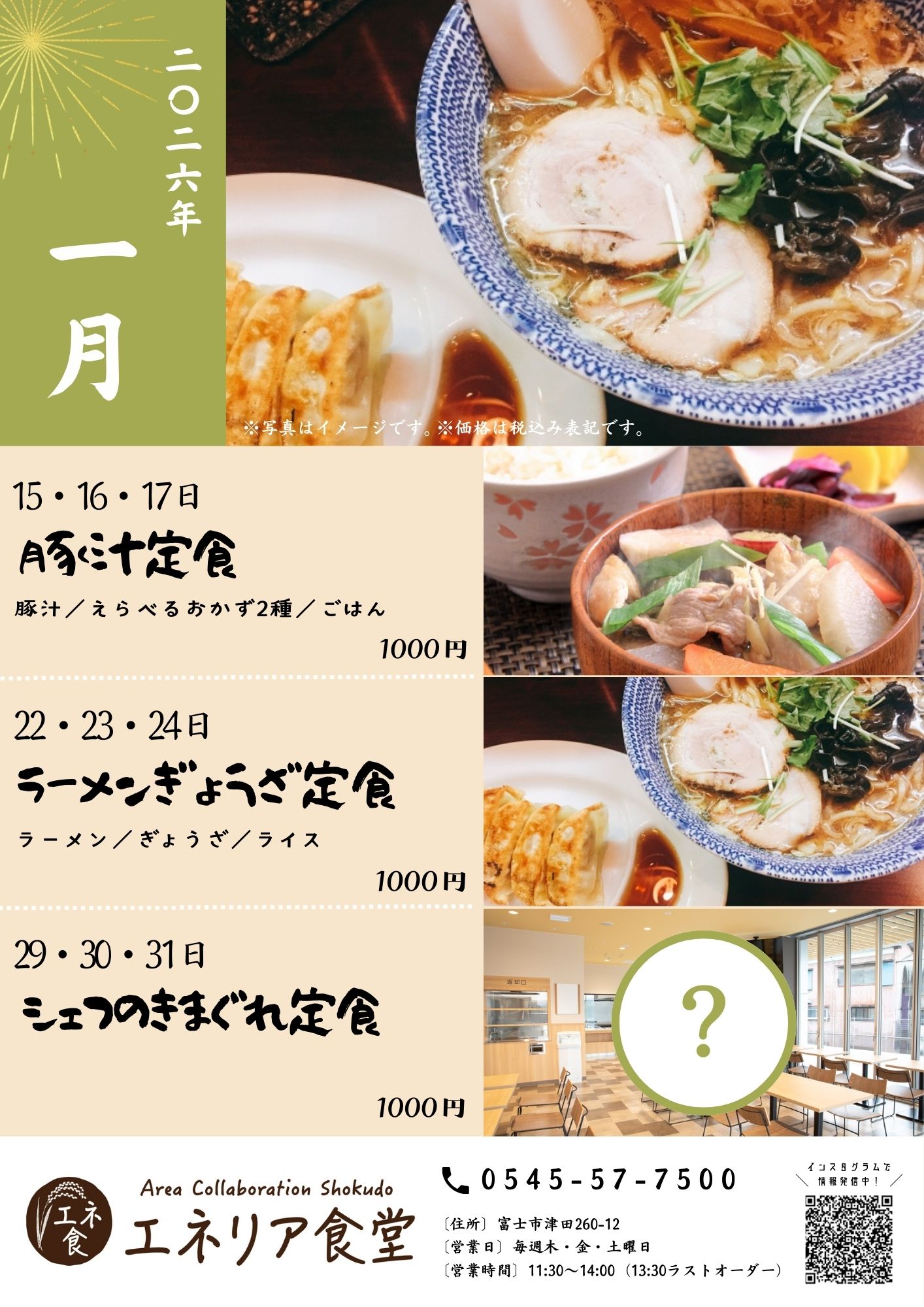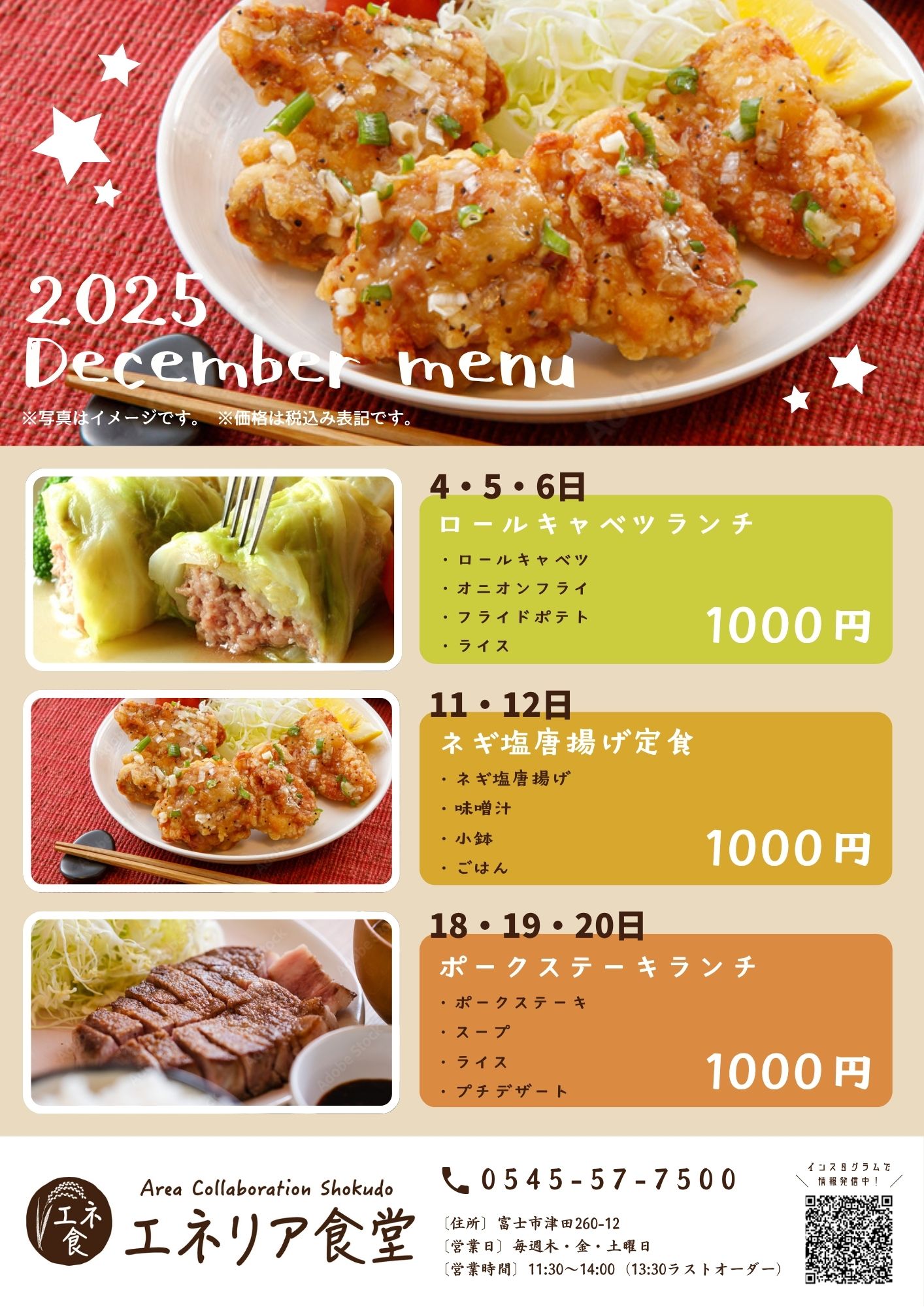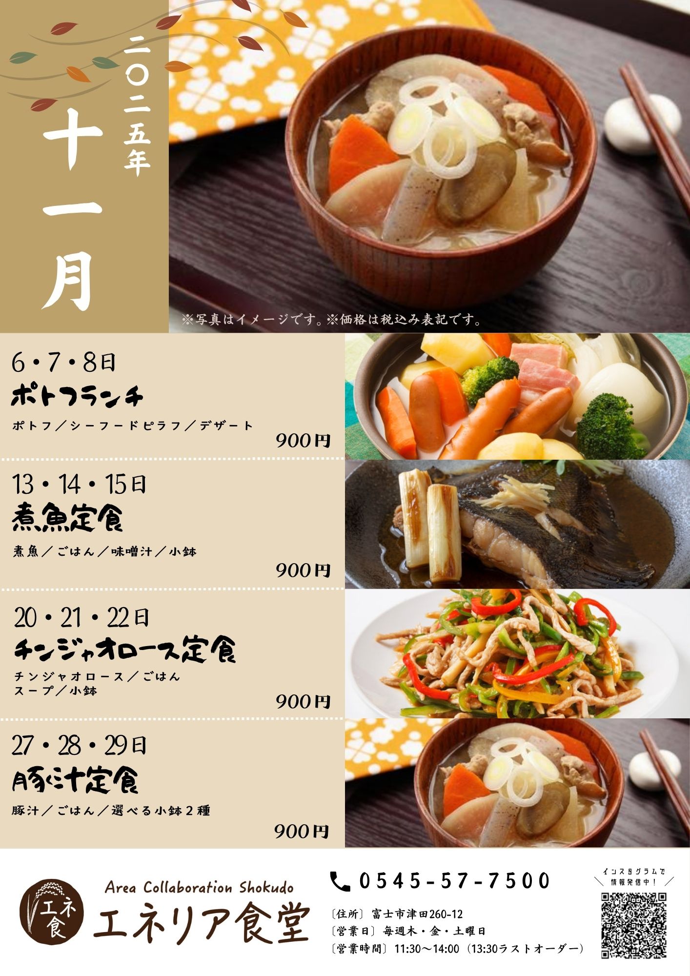 エネリアショールーム富士 住所 〒417-0034 富士市津田260-12 営業時間 9:30〜17:00 休館日 水曜定休(祝日の場合は営業・翌日休み) GW・夏季休暇・年末年始 アクセス 車:富士ICから6分 駐車場完備 ▶今月のエネリア食堂メニュー