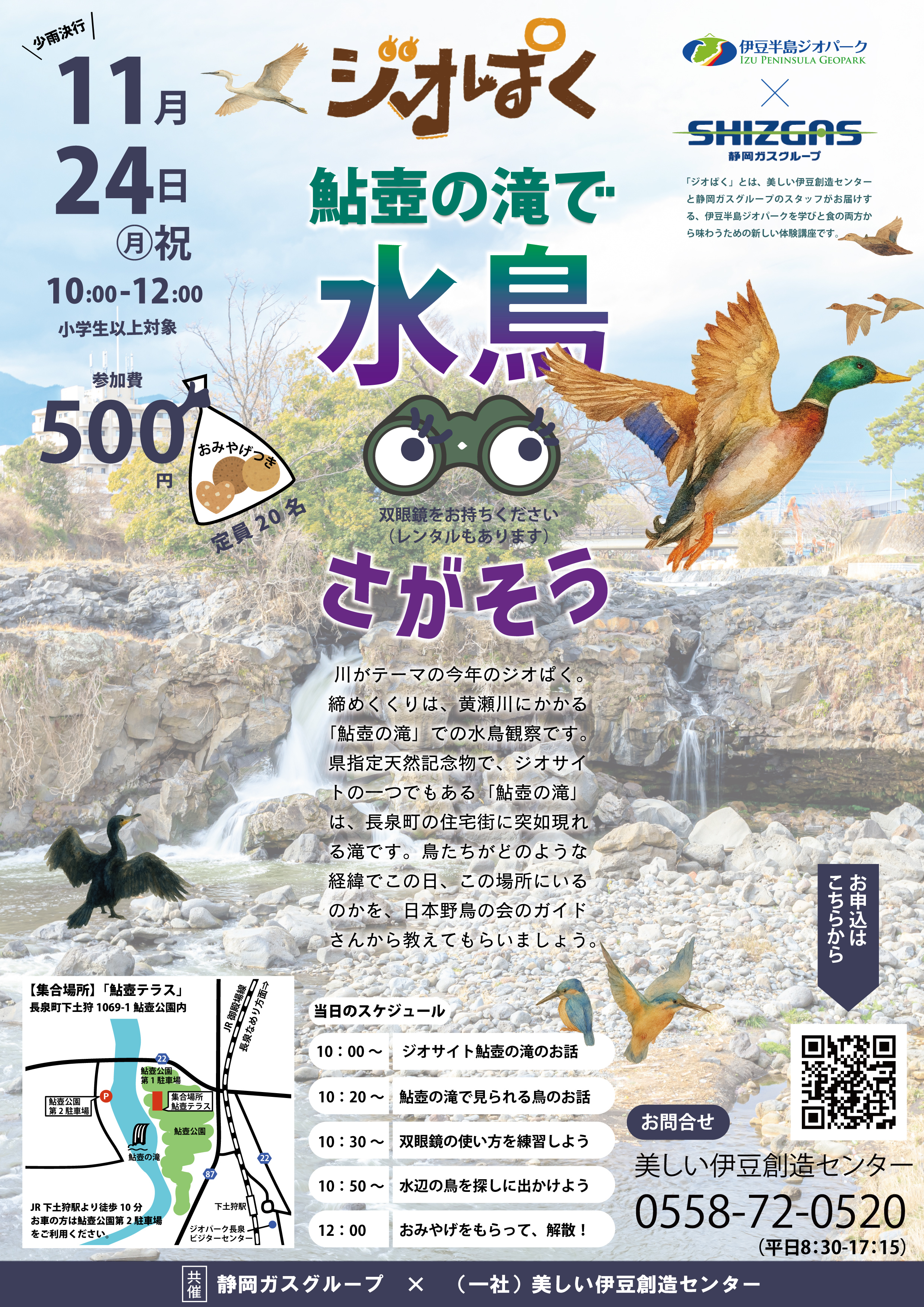 ジオぱく 食の探検隊「鮎壺の滝で水鳥さがそう(おやつ付き)」のご案内
