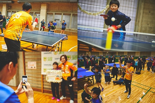 試合の空き時間には、静岡ジェード選手とのラリー体験や的当てゲームで楽しむこともできます。上級クラス優勝者は、現役Tリーガーとの試合チャンスも!