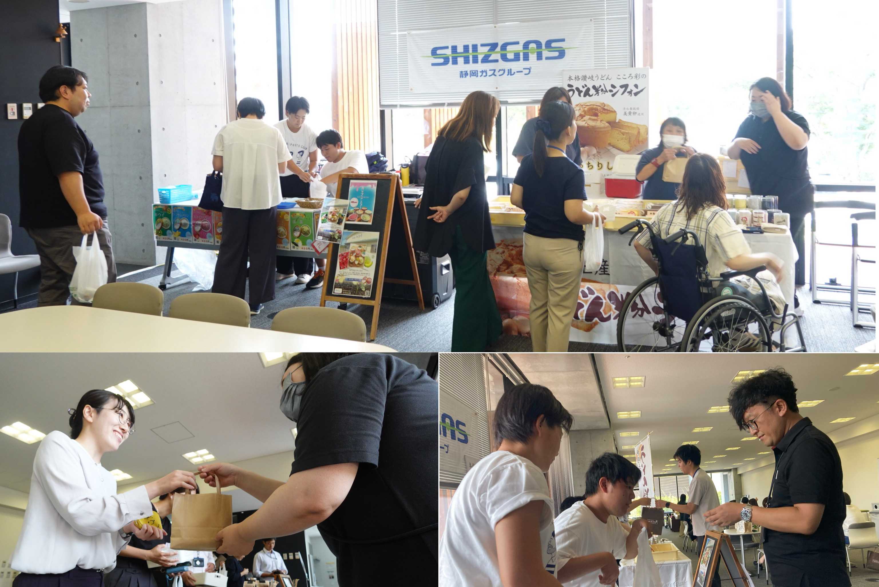 8月27日(水)、本社でふじのくに福産品(静岡県内の障がい福祉サービス事業所で作られた製品)の社内販売会を開催しました。まめったい様(静岡市)とやくわり様(袋井市)に出店いただき、シフォンケーキやジェラートなどが並びました。休憩時間のおやつや家族へのお土産用に多くの社員が購入し、大盛況となりました。