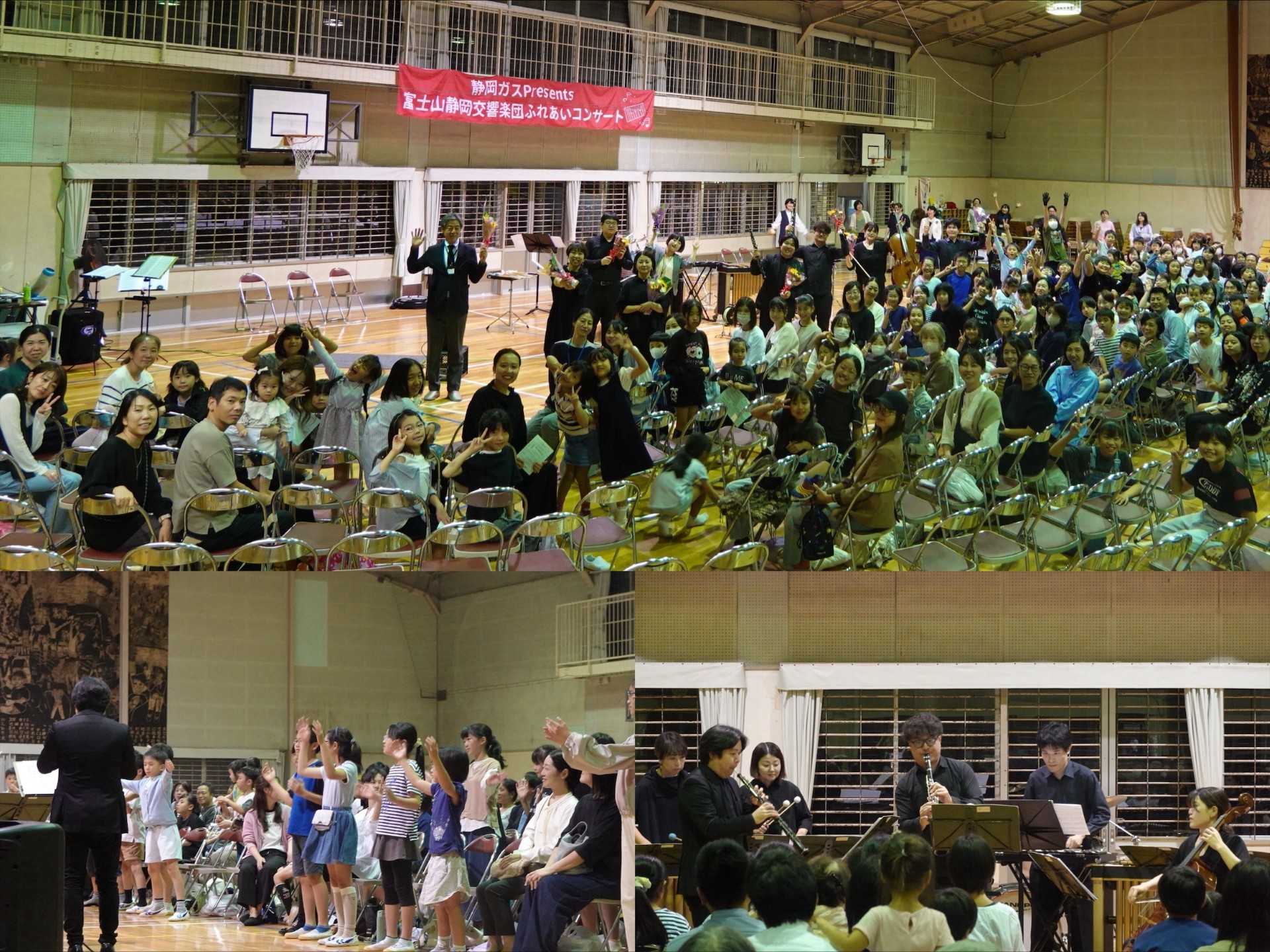 10月10日(金)、三島市立西小学校で「静岡ガスグループPresents富士山静岡交響楽団ふれあいコンサート」を開催しました。同校の創立100周年を祝うイベントとして実施され、約190名の児童や保護者、地域の方々にご来場いただきました。創立記念歌として地域で親しまれている「西の子」の演奏では、みんなで歌ったり、振り付けを踊ったりして、会場が一体となって音楽を楽しむ時間になりました。