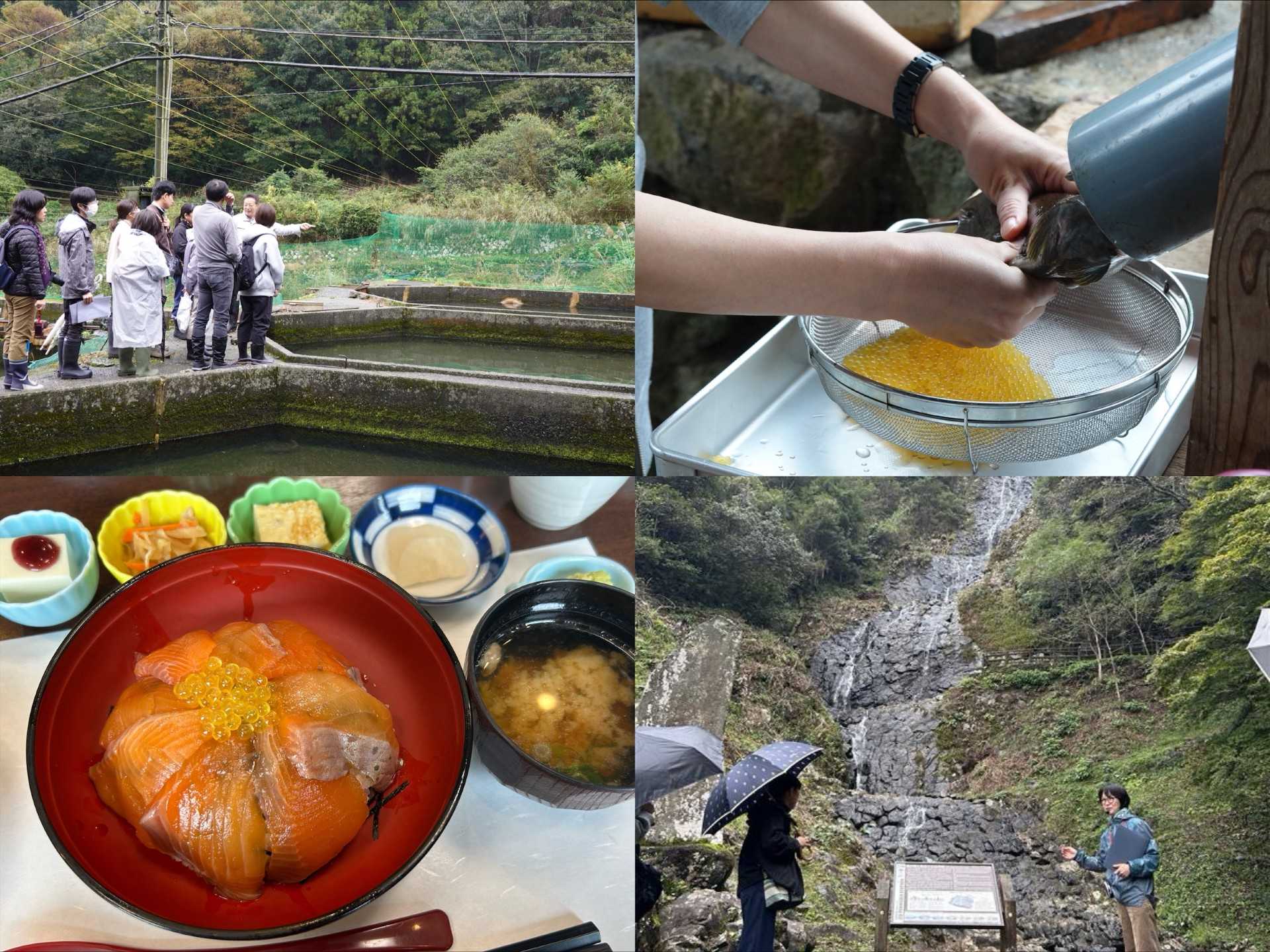 10月25日(土)、伊豆市にて、伊豆半島ジオパークと静岡ガスグループの連携イベントを開催し、9名の方が参加しました。伊豆の特産「紅姫あまご」の養魚場を見学し、「黄金いくら」と呼ばれる魚卵の採取を体験。昼食にはあまごの漬け丼を味わい、午後は旭滝や伊豆半島ジオパークミュージアムを巡り、伊豆の魅力を満喫しました。
