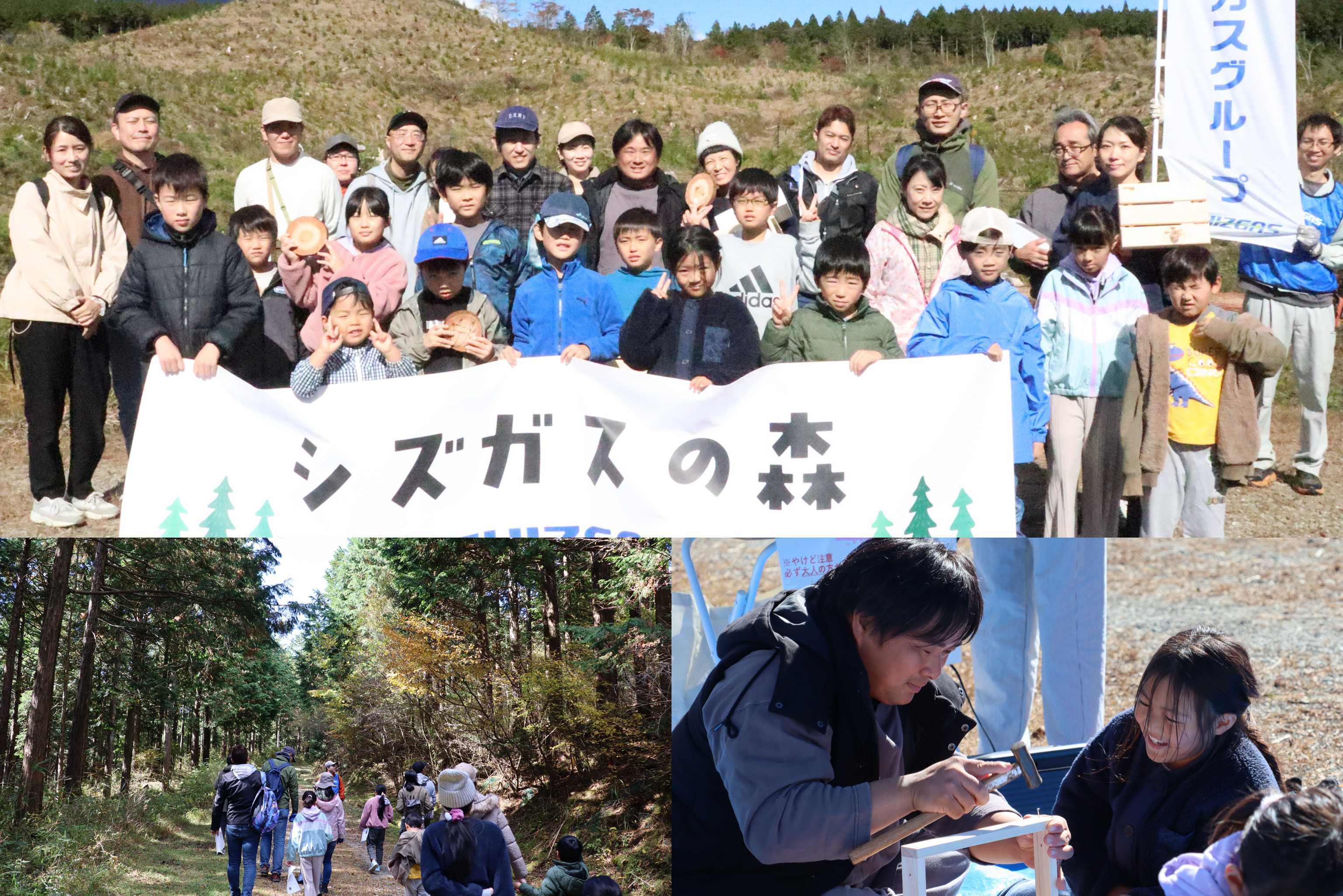 11月3日(月・祝)、富士市桑崎のシズガスの森で森林教室を開催しました。静岡県内外から小学生親子10組26名にご参加いただき、晴天のもと、森林探検やコースターづくりどの木工体験を行いました。